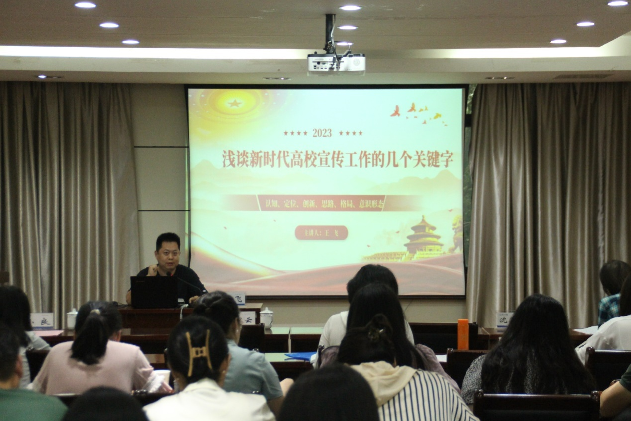王飞就认知、定位、创新、思路、格局、意识形态六个角度深度剖析了新时代高校宣传工作,并结合意识形态工作如何实施提出相应对策。他提出,学校的宣传工作应该把握好工作的尺度,不扩大,不虚构,要真真实实、明明白白的讲好学校故事;要精心策划,但要耐得住性子,适时开展宣传;宣传人员要能够守得住初心,不妄自菲薄,也不妄自尊大,要主动作为,做好学校的各项宣传工作。