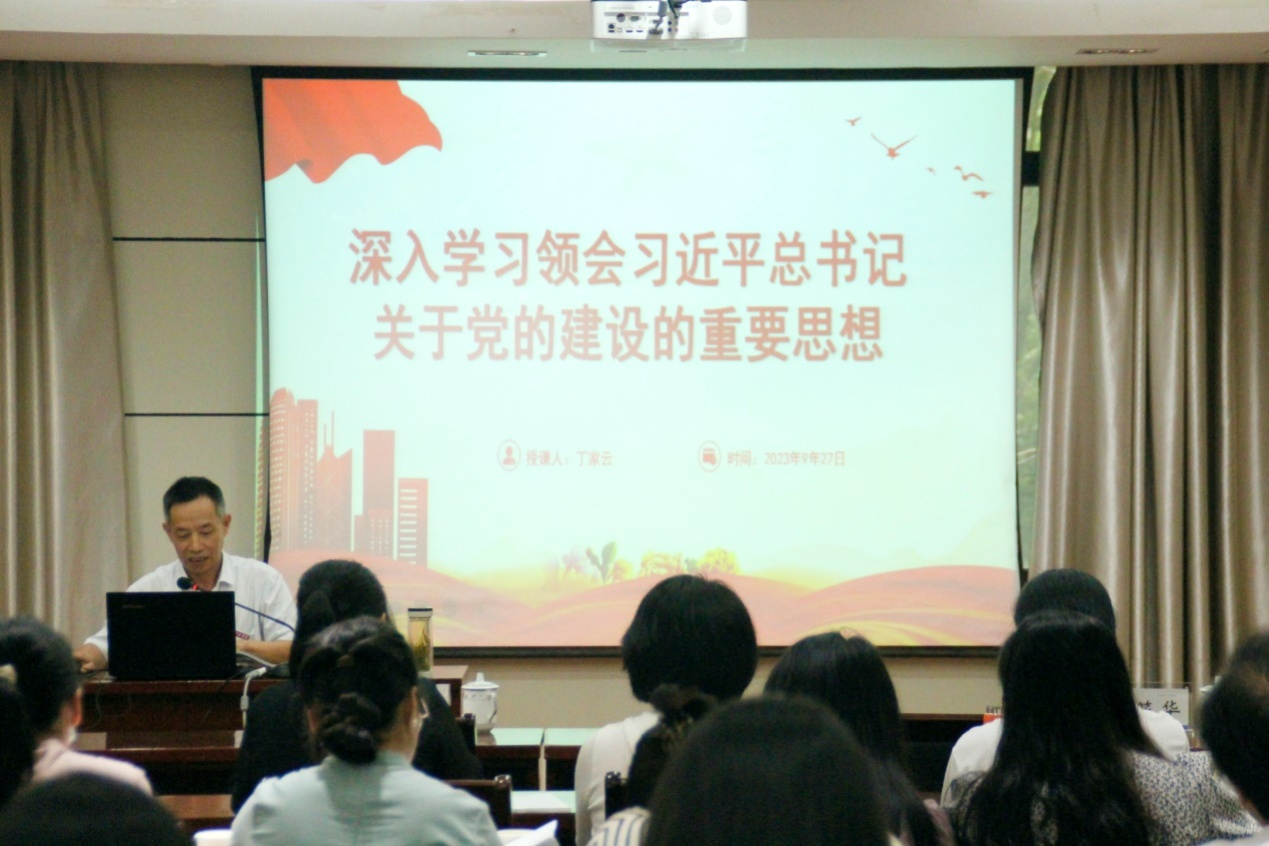 首先,丁家云作关于《习近平总书记关于党的建设的重要思想》专题报告,他指出,我们要坚持以习近平新时代中国特色社会主义思想为指导,深入学习贯彻习近平总书记关于党的建设的重要思想,确保党在新时代坚持和发展中国特色社会主义的历史进程中始终成为坚强领导核心。随后,他围绕“充分认识习近平总书记关于党的建设的重要思想的重大意义”、“深入把握习近平总书记关于党的建设的重要思想的丰富内涵”和“如何把习近平总书记关于党的建设重要思想学习领会好、贯彻落实好”三个方面深入阐释。