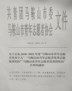 近日,由共青团马鞍山市委、马鞍山市青年志愿者协会印发《关于公布2018-2022年度“马鞍山市青年志愿者优秀个人”“马鞍山市青年志愿者优秀志愿服务组织”“马鞍山市青年志愿者优秀团组织”名单的通知》,我校青年志愿者协会荣获“马鞍山市青年志愿者优秀志愿服务组织”称号。
