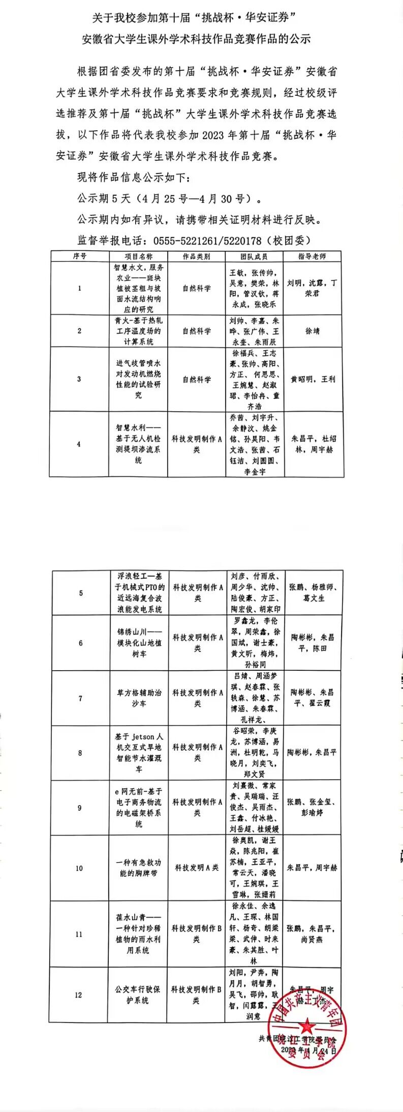 关于我校参加第十届“挑战杯*华安证券”安徽省大学生课外学术科技作品竞赛作品的公示