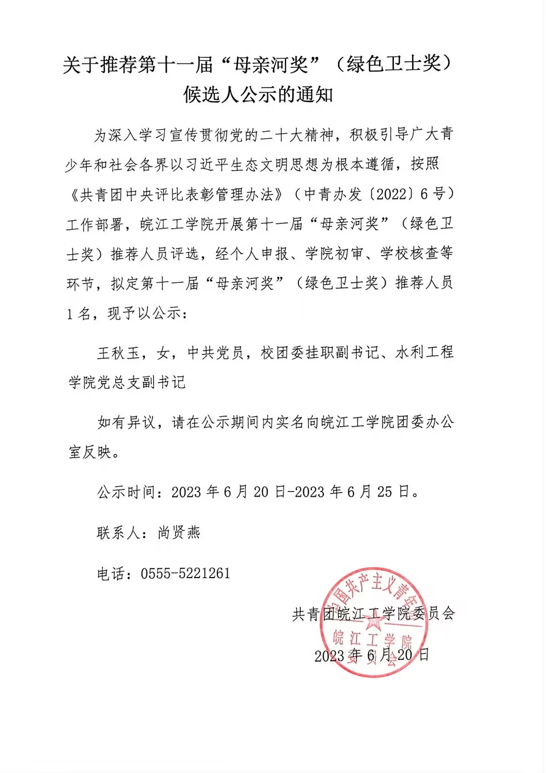 关于推荐第十一届“母亲河奖”(绿色卫士奖)候选人公示的通知