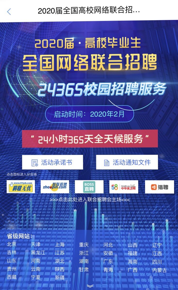 为深入贯彻习近平总书记在统筹推进新冠肺炎疫情防控和经济社会发展工作部署会议上的重要讲话及系列指导批示精神,认真贯彻落实国务院常务会关于鼓励吸纳高校毕业生就业的工作部署,教育部大学生就业网会同各地毕业生就业,联合前程无忧、智联招聘、BOSS直聘、中华英才网和猎聘网开展2020届高校毕业生全国网络联合招聘—24365校园招聘服务活动,为高校毕业生提供每天24小时全年365天的网上校园招聘服务,共同促进高校毕业生就业。