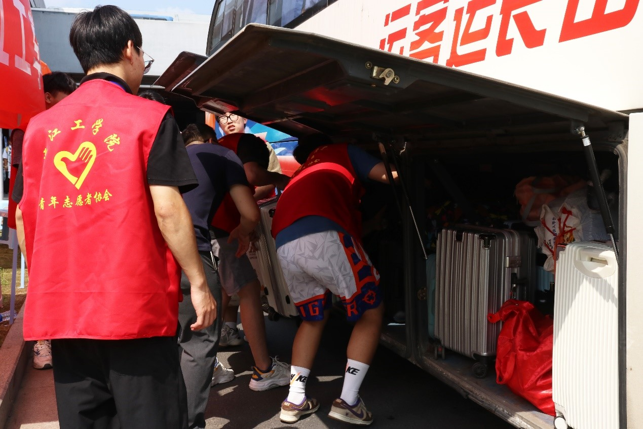 为确保新生报到快速、便利、安全,学校组织安排各二级学院、相关部门教职工和迎新志愿者到达马鞍山东站、郑蒲港校区各报到接待点迎接新生,安排迎新专用大巴,为新生及家长提供免费的班车接送服务,助力新生从校外车站到宿舍的“零距离”。