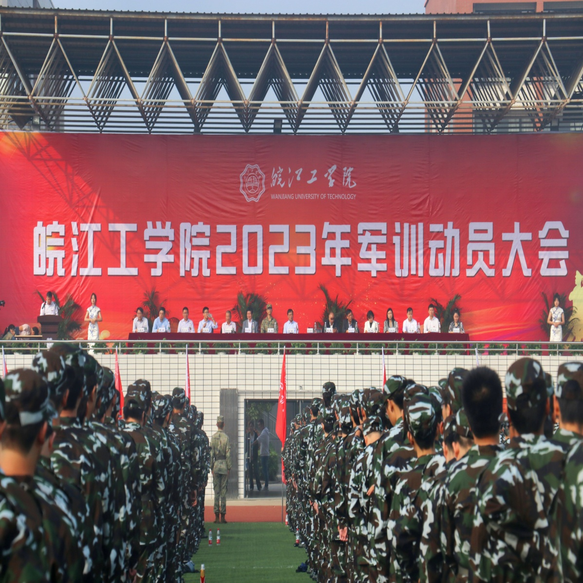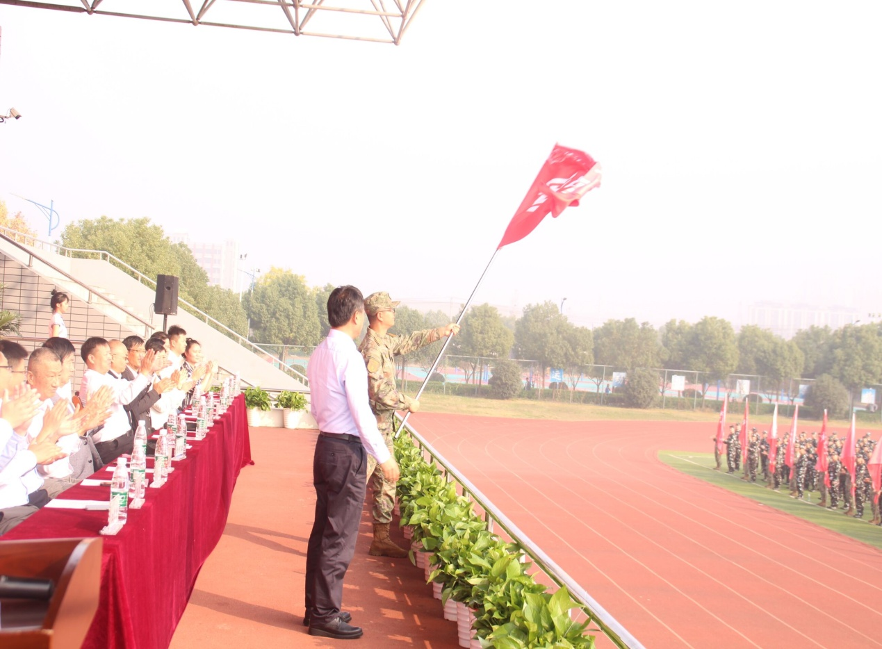 最后,江春明宣读军训团成员名单,孙良向军训部队授旗。在迎风招展的红旗下,2023级新生军训动员大会圆满结束。