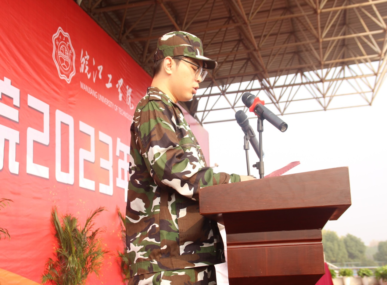 受训学生代表2023地质工程专业张跃同学发表讲话。他表示军训期间将强化时间观念,严格践行“四要”、“六不“、“四言”等要求,最后他代表全体2023级同学庄严承诺:一定会秉承团结、学用结合、知难而进、创新发展的精神,以皖工人的品质、皖工人的气魄严肃认真高标准高质量的完成好本次军训。