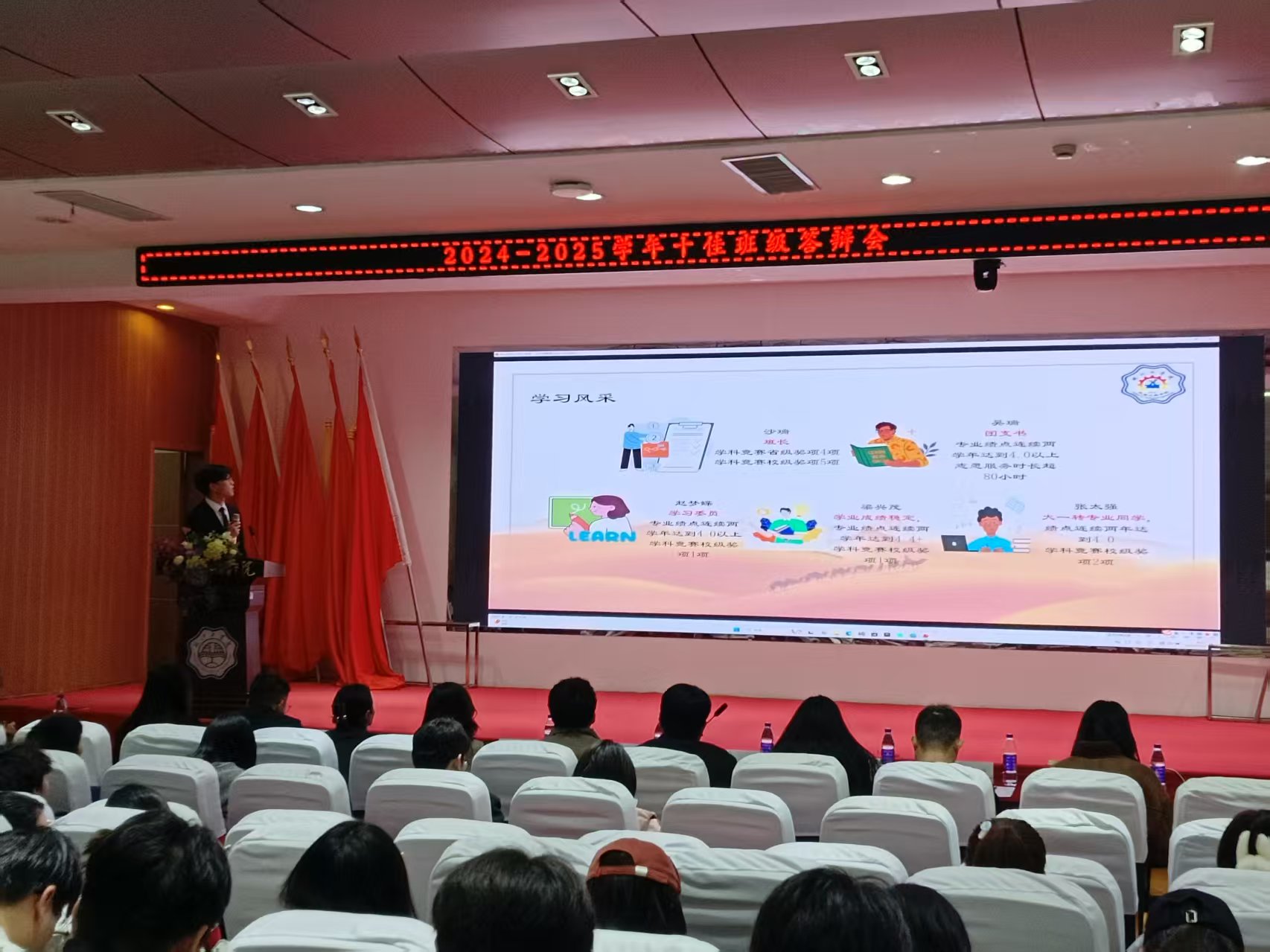 本次答辩会以“学风建设为核心、全面发展为目标”,严格参照学风建设、现场表现两大评分维度,重点考察班级班规建设、学业成绩、竞赛成果、党团建设、社会实践等方面情况。各班级答辩人精神饱满、逻辑清晰,通过PPT展示、现场讲解等形式,生动展现了班级的凝聚力与战斗力。