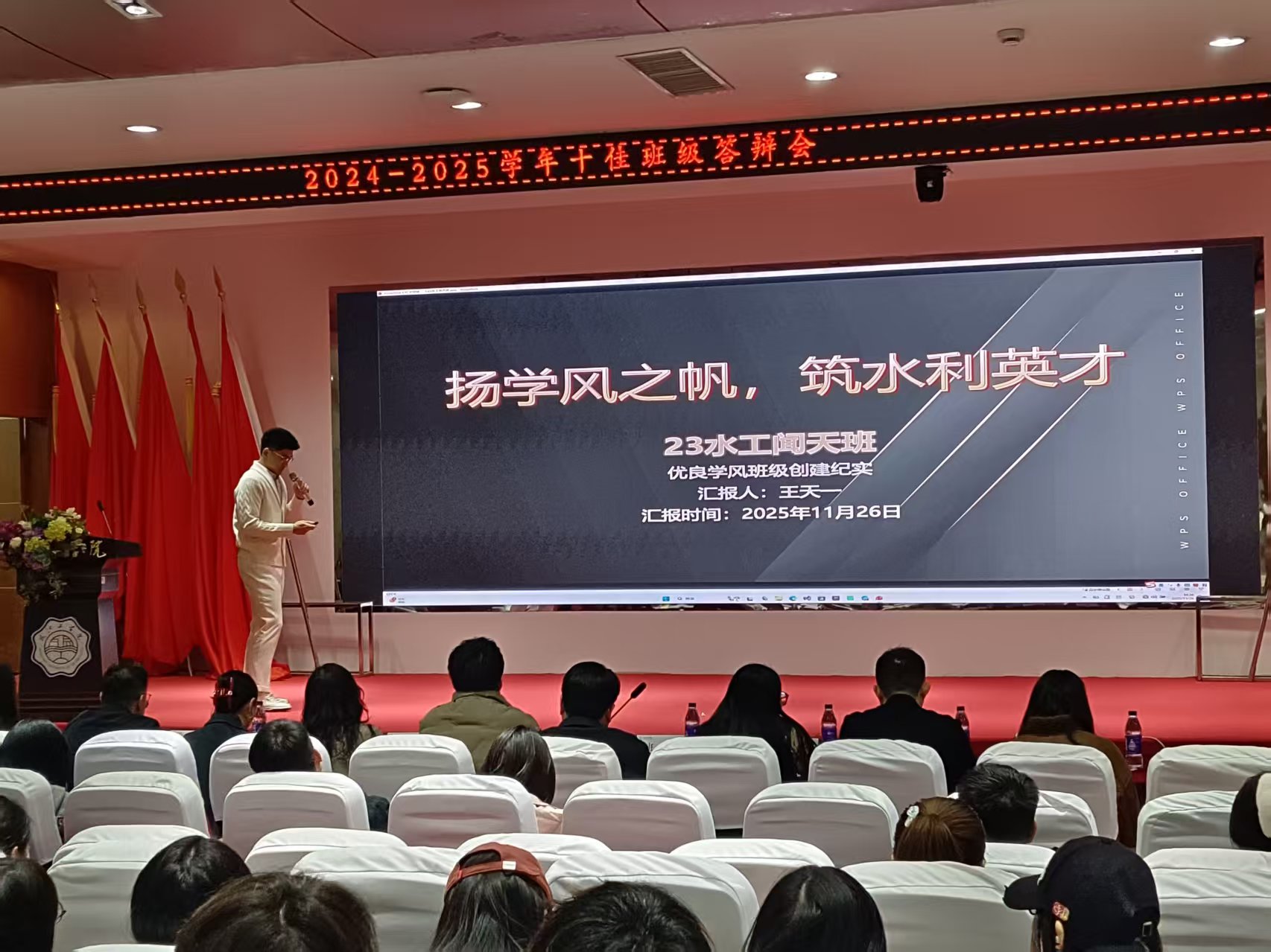 11月26日下午,我校2024-2025学年“十佳班级”答辩会圆满落幕。来自全校8个学院的优秀班级同台竞技,通过风采展示、成果汇报等环节,全方位呈现班级建设的丰硕成果,最终11个班级(含并列)脱颖而出,获评“十佳班级”。