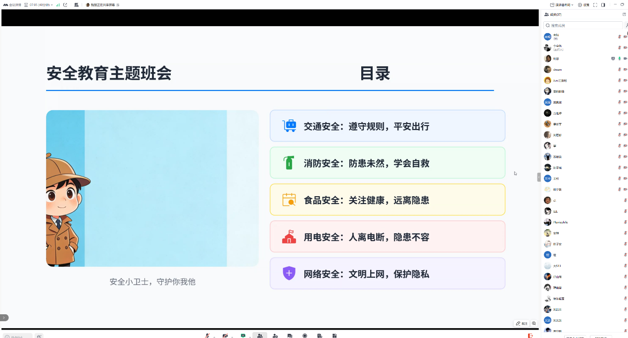 班会开场,班主任鲍慧强调,安全无小事,假期是各类安全事故的易发高发期,本次班会将围绕交通安全、消防安全、食品安全、用电安全及网络安全五大核心领域展开,通过真实案例剖析,为同学们开展一次全面且生动的安全知识科普,切实提升大家的风险防范能力。