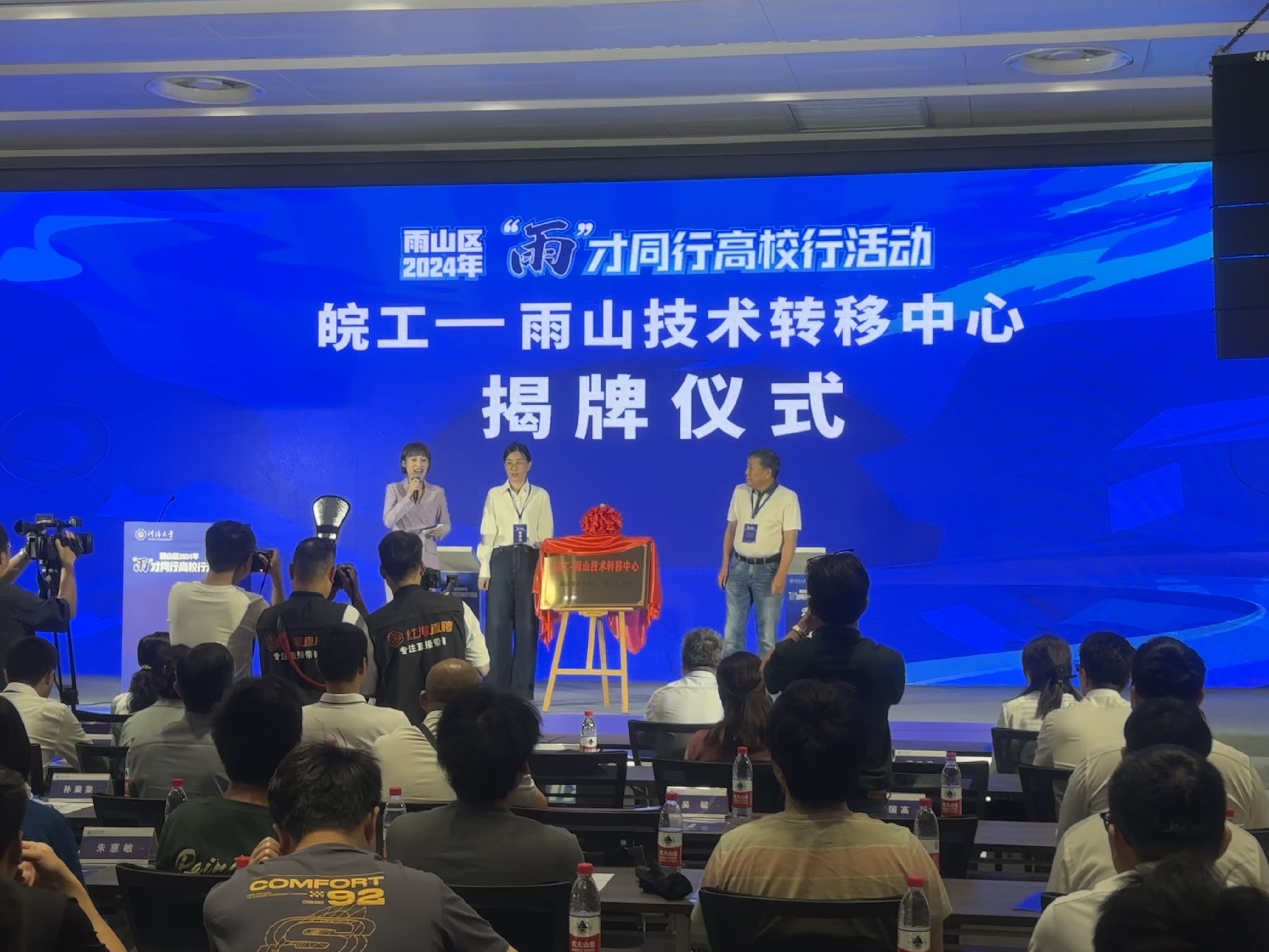 在与会人员的共同见证下,团雨山区委书记王堃,河海大学团委副书记房阔,皖江工学院团委书记兼学生工作部副部长尚贤燕共同签署了“雨燕栖”大学生社会实践基地共建协议并为基地揭牌。随后,雨山区委常委,雨山经济开发区党工委书记、管委会主任蔡田词,皖江工学院科技部部长胡钢共同签署了皖工-雨山技术转移中心共建协议并为转移中心揭牌。