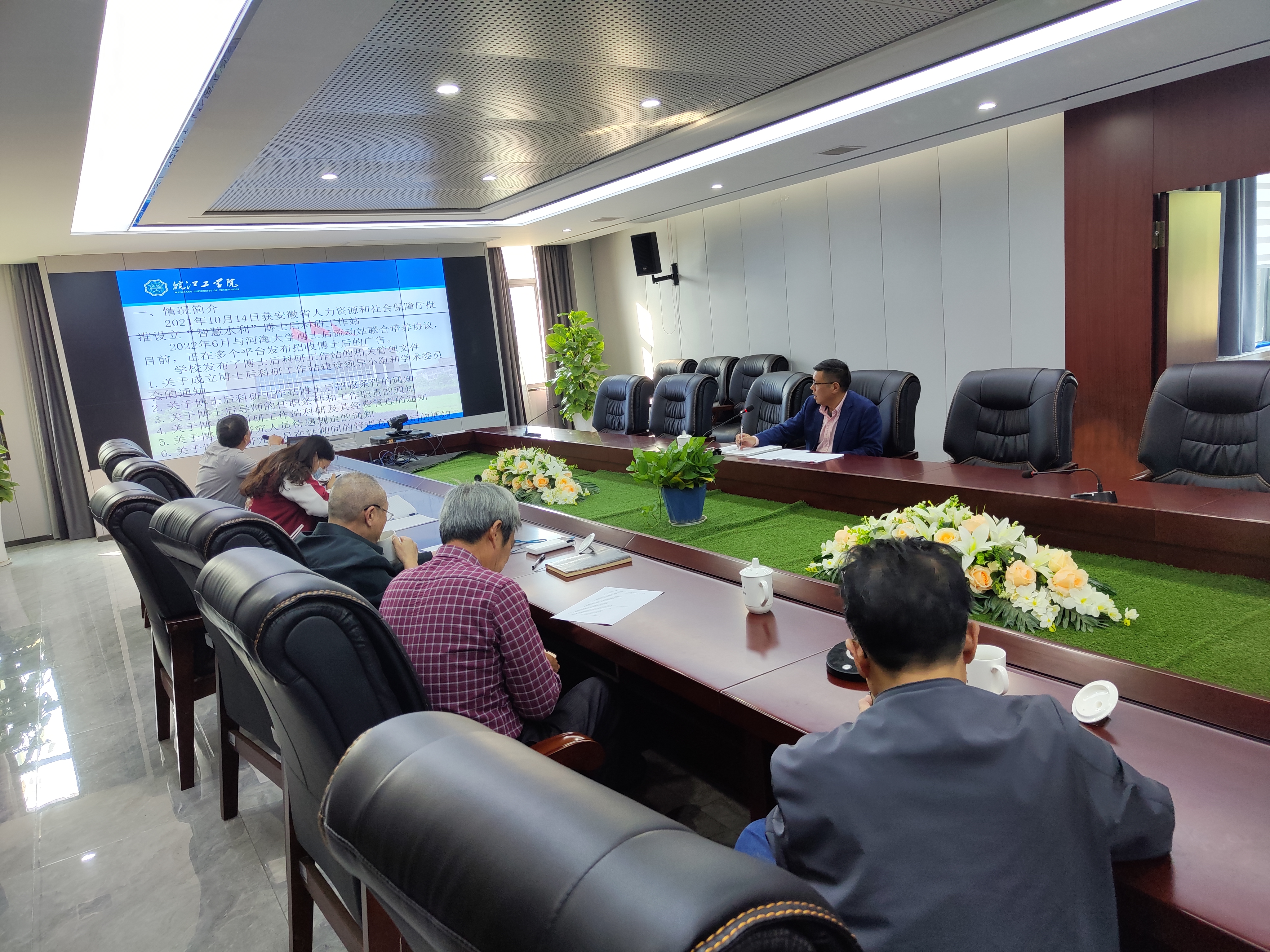 由于疫情原因,本次会议采用线上线下相结合的方式。会上,科技部部长胡钢汇报了皖江工学院博士后科研工作站管理条例相关内容,并请各位委员对博士后科研工作站管理进行研讨,并对博士后进出站条件提出宝贵意见和建议。