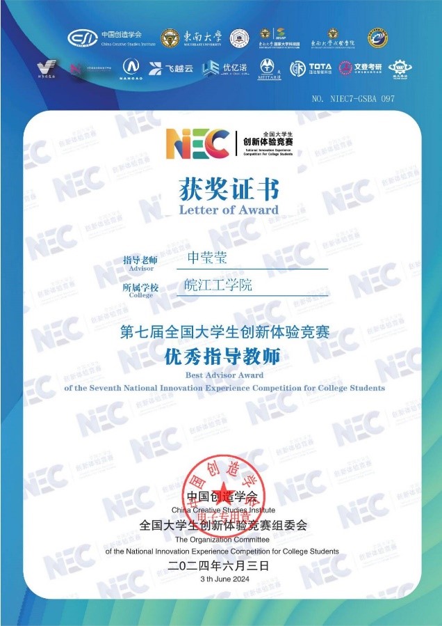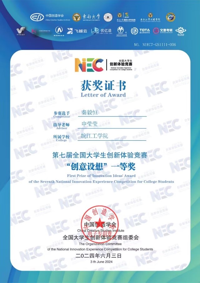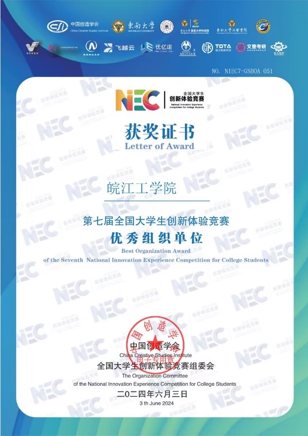 近日,第七届全国大学生创新体验竞赛总决赛落下帷幕。本次比赛于2024年5月在线上隆重举行,吸引了来自全国各地的众多优秀选手参赛。经过网络初评、复赛以及决赛评委会在线答辩评审等环节的激烈角逐,我校学生表现优异,秦毅恒同学获得全国一等奖一项,徐国斌、马骋骋、丁源同学共夺得全国三等奖三项,皖江工学院荣获优秀组织单位,申莹莹老师获得优秀指导老师称号。我校长期坚持“厚基础、强能力、高素质”的教育理念,为学生提供了创新与产业工程师学院等全面学习和发展的平台。通过加强学科建设、深化教学改革、强化实践教学等一系列举措,不断提升学生的专业素养和综合能力,为社会培养优秀人才。
