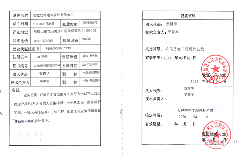 公司前身为合肥市建设装饰集团设计室,2001年改制更名为合肥安博建筑装饰设计有限公司,2005年升为建筑行业(建筑工程)乙级资质并更名为安徽安博建筑设计有限公司,2011年公司注册地址变更为安徽省马鞍山市,2014年申报通过人民防空工程设计乙级资质。公司下设综合办公室、财务室、总工程师办公室、建筑设计所。公司现有一级注册建筑师两名、一级注册结构工程师一名、二级注册结构工程师一名。公司现有在职人员近三十人,中级及中级技术以上职称人员十六名,其中教授级高工一名,高级工程师六名,中级工程师九名。我司技术总工拥有丰富的项目经验,曾参与主持过多项大型项目的设计。公司主要代表作有:广德人民医院医技楼、郑蒲港大许中心村、华旺股份马鞍山基地、马鞍山信诚大厦、和县小商品市场等。