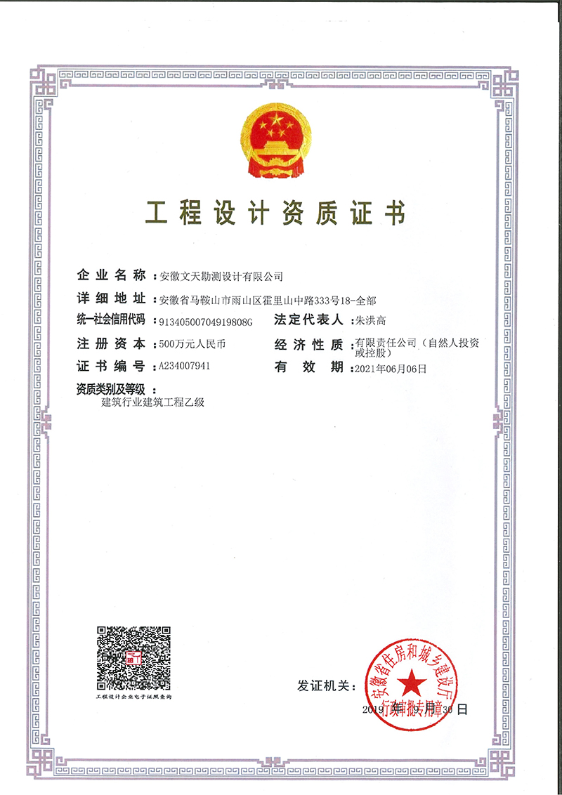 安徽文天勘测设计有限公司系由皖江工学院(原河海大学文天学院)将原安徽安博建筑设计有限公司重组而成。公司拥有建筑行业(建筑工程)乙级、人民防空工程设计乙级以及建筑智能化系统设计、消防工程设计等相关专项设计资质。依托皖江工学院教学、科研的优势和安徽安博建筑设计有限公司长期从事于民用、工业、人防等工程设计经验,具备大中型建筑工程、人防工程的设计及勘察能力。