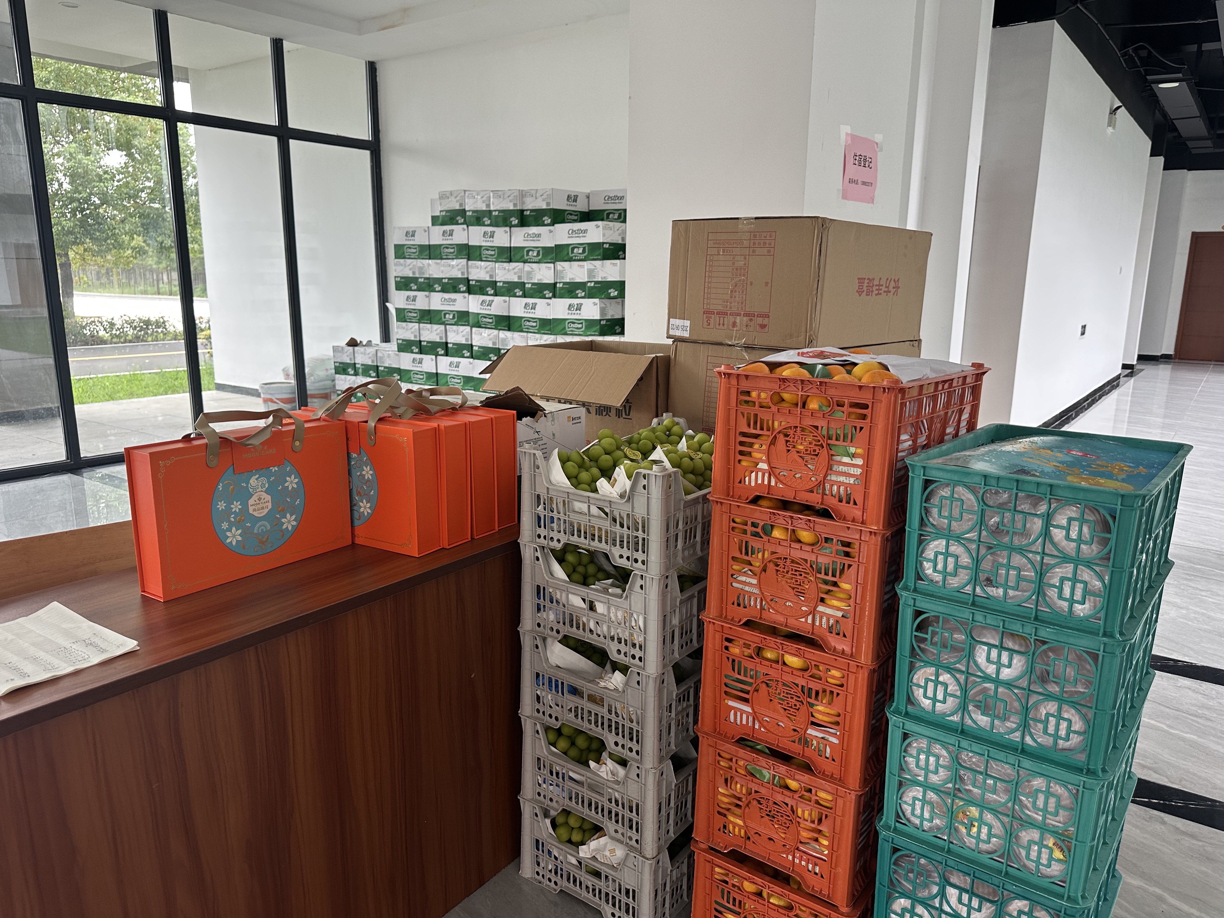 检阅结束后,学校向承训教官送上包含新鲜水果、月饼等在内的慰问物资。这些物资不仅为教官提供了物质补给,更彰显了学校对教官辛勤工作的认可与尊重。慰问物资已提前整齐摆放于教官住处大厅,等候教官领取。