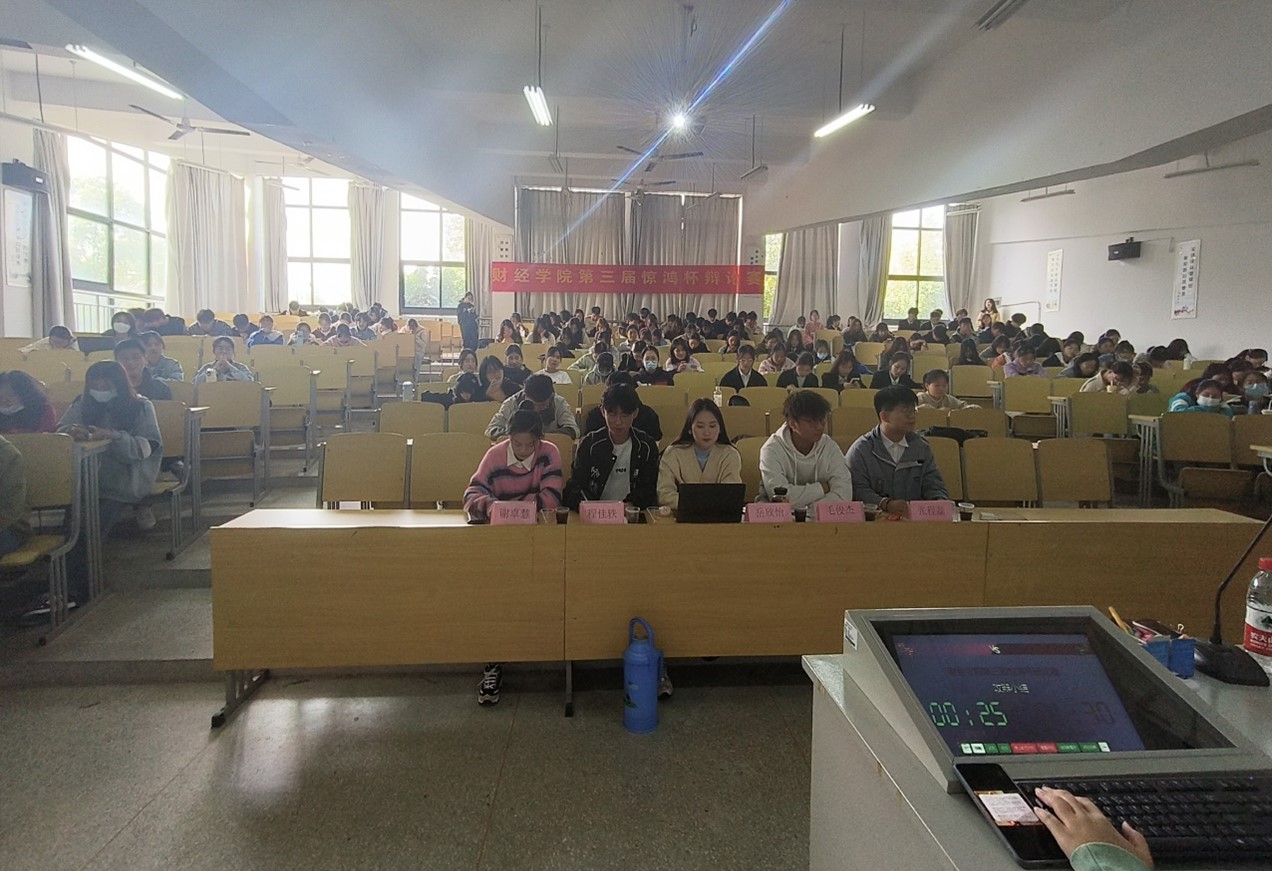 2022年11月5号财经学院第三届“惊鸿杯”辩论赛于郑蒲港校区B101教室顺利举行。