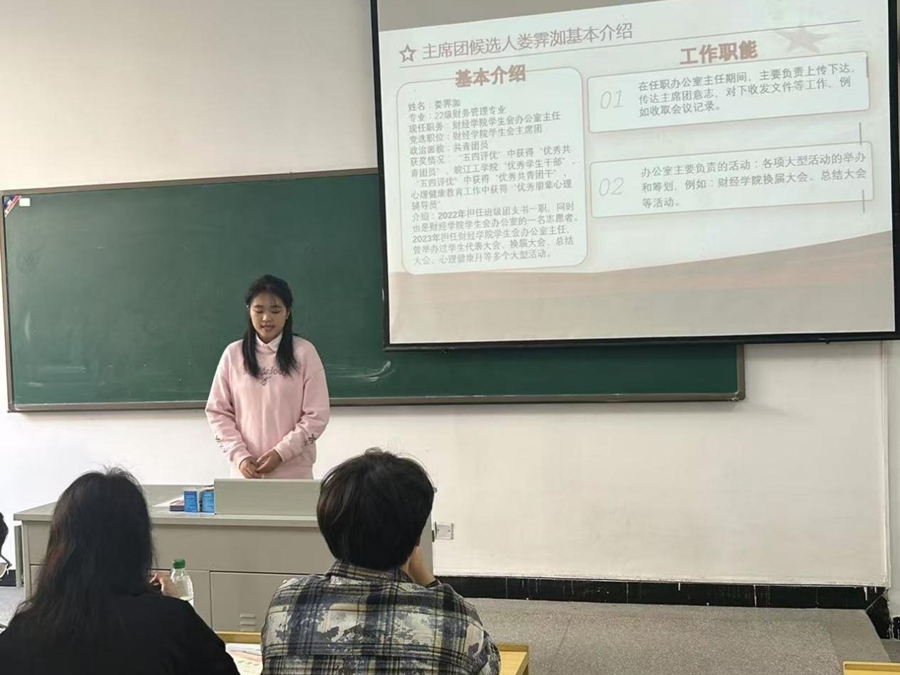 大会通过选举产生财经学院第五届学生会主席团,候选人依次上台发言,最终投票选举产生第五届学生会主席团成员的候选人名单分别为娄霁洳、陈露露、余扬。
