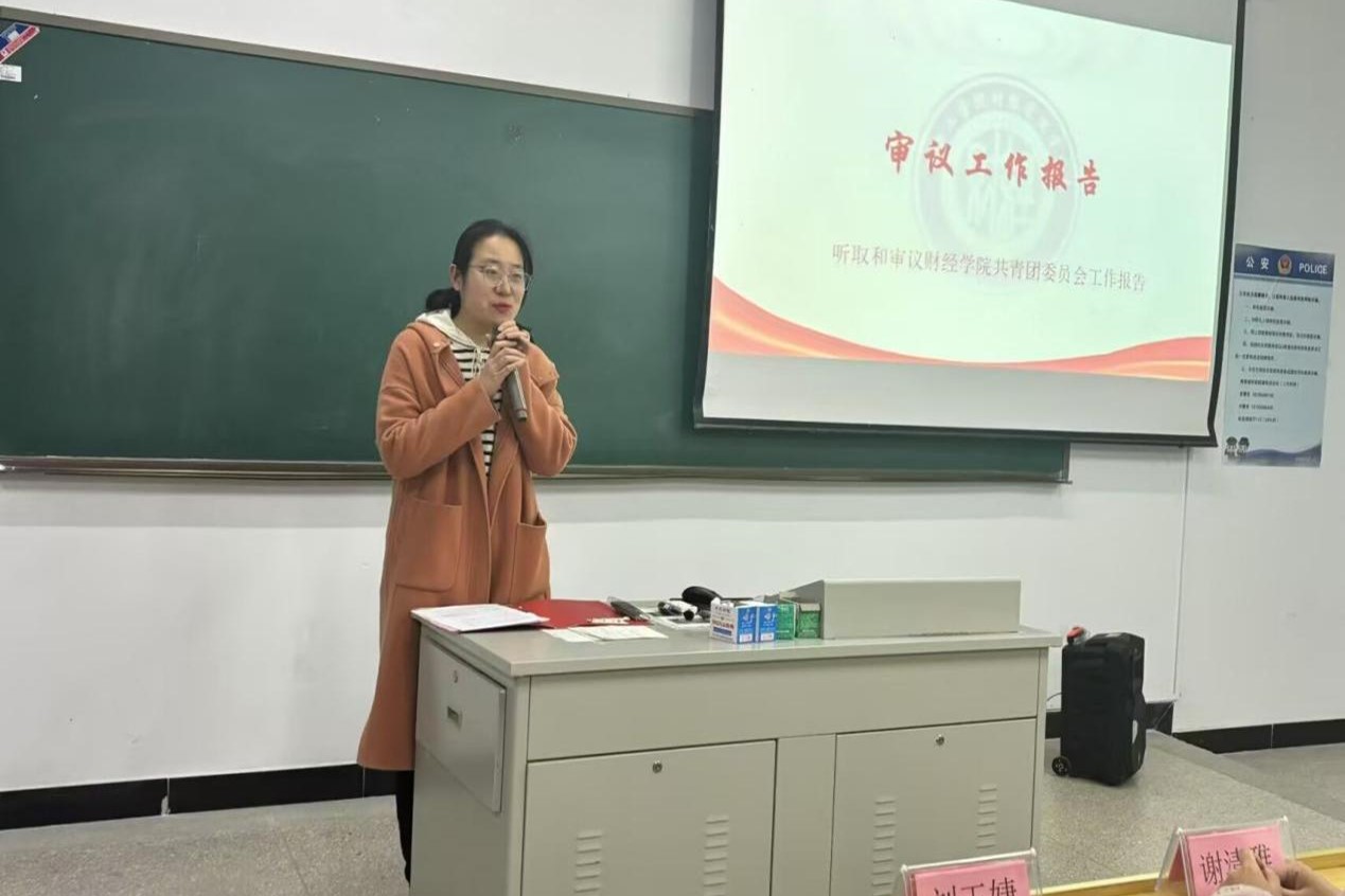 大会第一项 -- 听取和审议刘玉婕老师做的财经学院共青团委员会工作报告。报告充分肯定了我院开展的采石矶研学活动、十佳歌手大赛、主持人大赛等活动,这些活动的成功举办推进了我院的创新建设和校园文化建设。