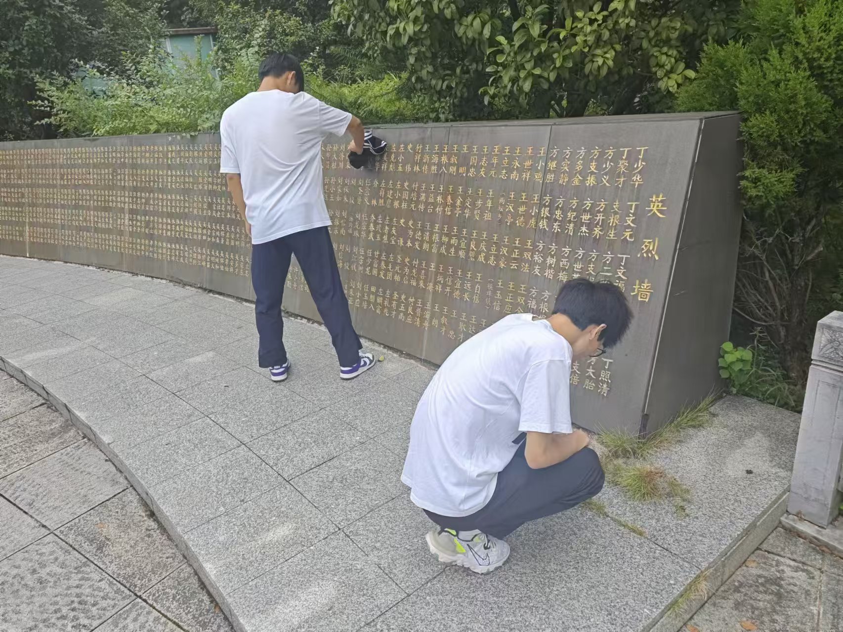 图为实践队员在英烈墙前默哀、扫墓。 实践队员 张凯文 摄
