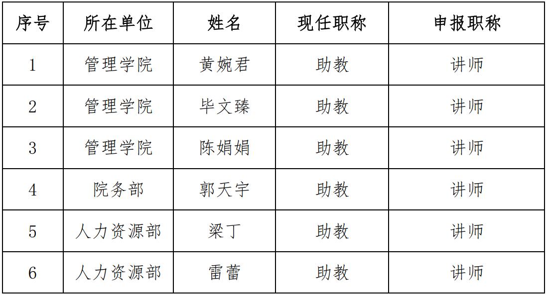 依据《皖江工学院2020年度教师(实验系列、专职辅导员)专业技术资格评审办法》(皖工校政〔2020〕183号),经由教师本人申请,管理院进行审核与推荐,现将推荐名单及申报情况公示如下: