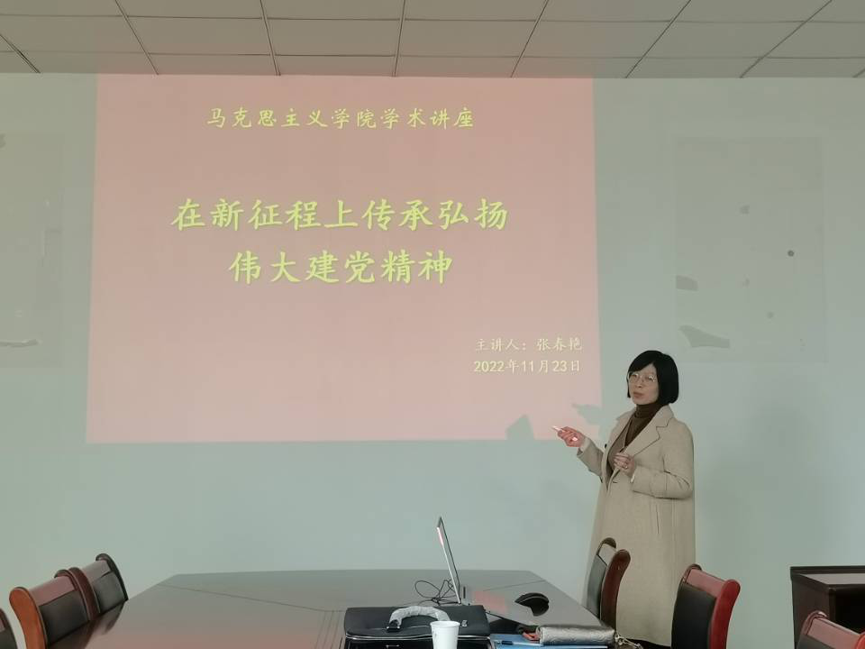 11月23日下午,马克思主义学院举办教师学术讲座,邀请我学院概论与纲要教研室主任、副教授张春艳作《在新征程上传承弘扬伟大建党精神》学术讲座,马原与德法教研室主任、副教授赵萍作《十字路口处的中国方向:走人类命运共同体之路》学术讲座,马院全体教师参加,会议由常务副院长刘双主持。