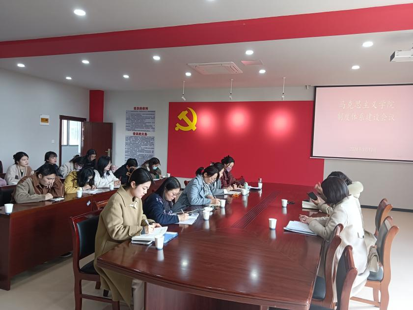为推动马克思主义学院制度建设工作走深走实。3月13日,马克思主义学院在党员活动室召开制度体系建设会议,马克思主义学院常务副院长、党总支书记刘双、院长助理张春艳、各教研室主任、行政办、教学办及全体教师参加,会议由刘双主持。