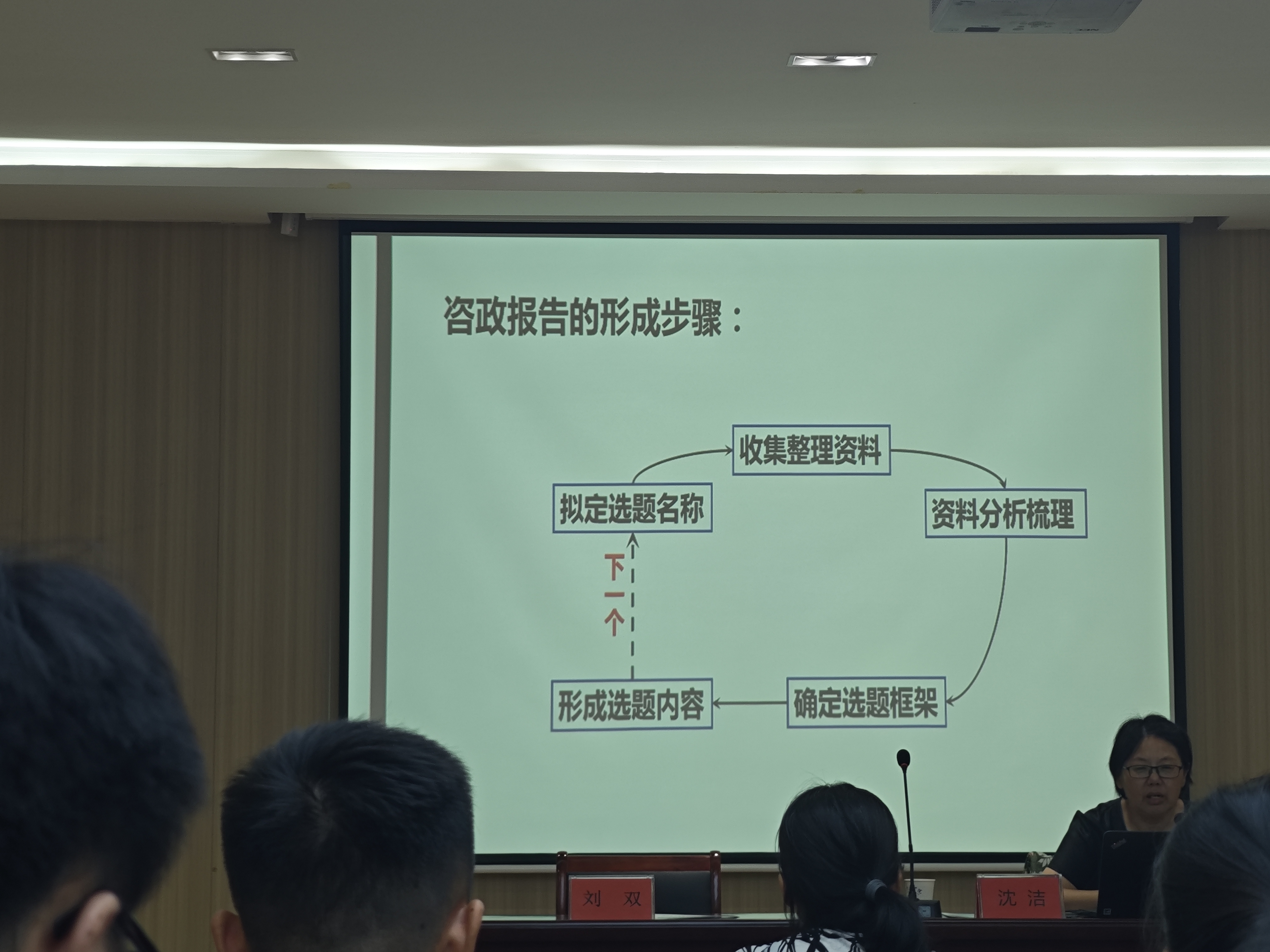 沈洁以《奋力打造安徽的“杭嘉湖”,长三角的“白菜心”》为题,分享马鞍山市总体规划和城市定位,分别从产业转型、城乡融合、社会治理和生态环保等方面详细阐述。当天,她还以《如何写好资政报告》为题,为全院教师做了资政报告撰写能力培养讲座。讲座中,就资政报告的行文步骤、研究方向及选题来源作出详细的讲解。她强调,资政报告是立足国情、社情、民情,围绕热会热点话题进行撰写,要把握时机,选题准确,深入调研把握实际情况,具有前瞻性和针对性。