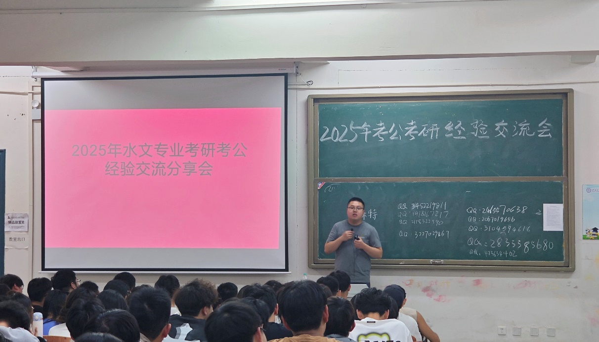 为助力学生科学规划学业与职业发展,提升考研考公竞争力,水利工程学院水文专业在5月14日晚上7点于弘思楼S207召开考研考公经验分享交流会,此类活动从2013年开始已举办十一届。本次活动特别邀请2025届成功考取研究生、公务员及事业单位的14名优秀学子分享备考经验。水利工程学院副院长张鹏、水文教研室专业教师和水文专业有考研考公意向的学生约200人参加。