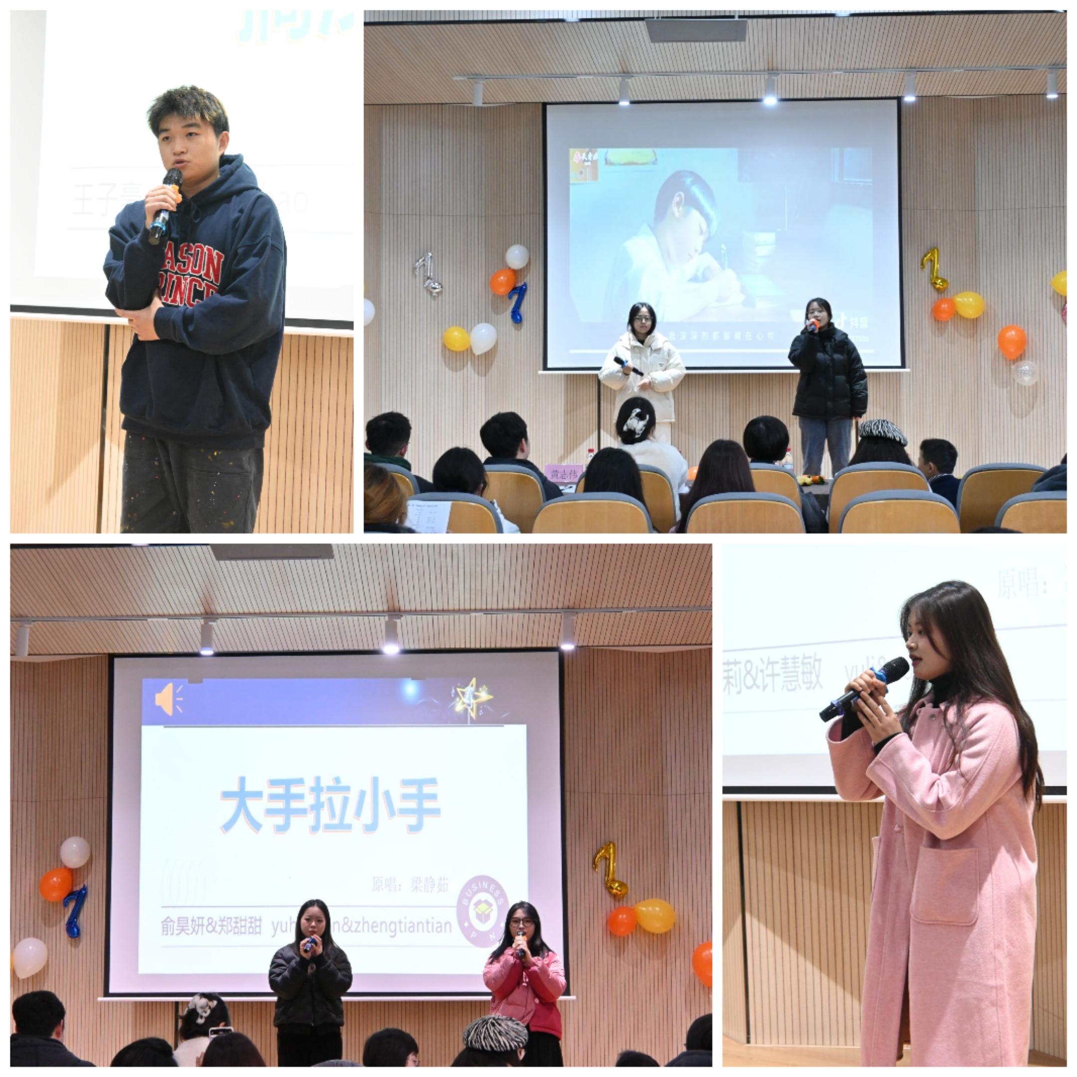 为深入学习宣传贯彻党的二十大精神,增强文化自信,丰富校园文化生活,提高我院学生的艺术素养和审美情趣,努力营造积极进取、健康向上、充满青春活力的校园文化氛围。12月24日,艺术设计学院第三届“梦想之声”十佳歌手大赛在东教楼报告厅顺利举行。学院党总支副书记程楠楠、分团委书记刘慧、2023级辅导员左镜鸥、院学生会执行主席黄志伟担任比赛评委,2023-2024学年全体班主任参与了此次活动。