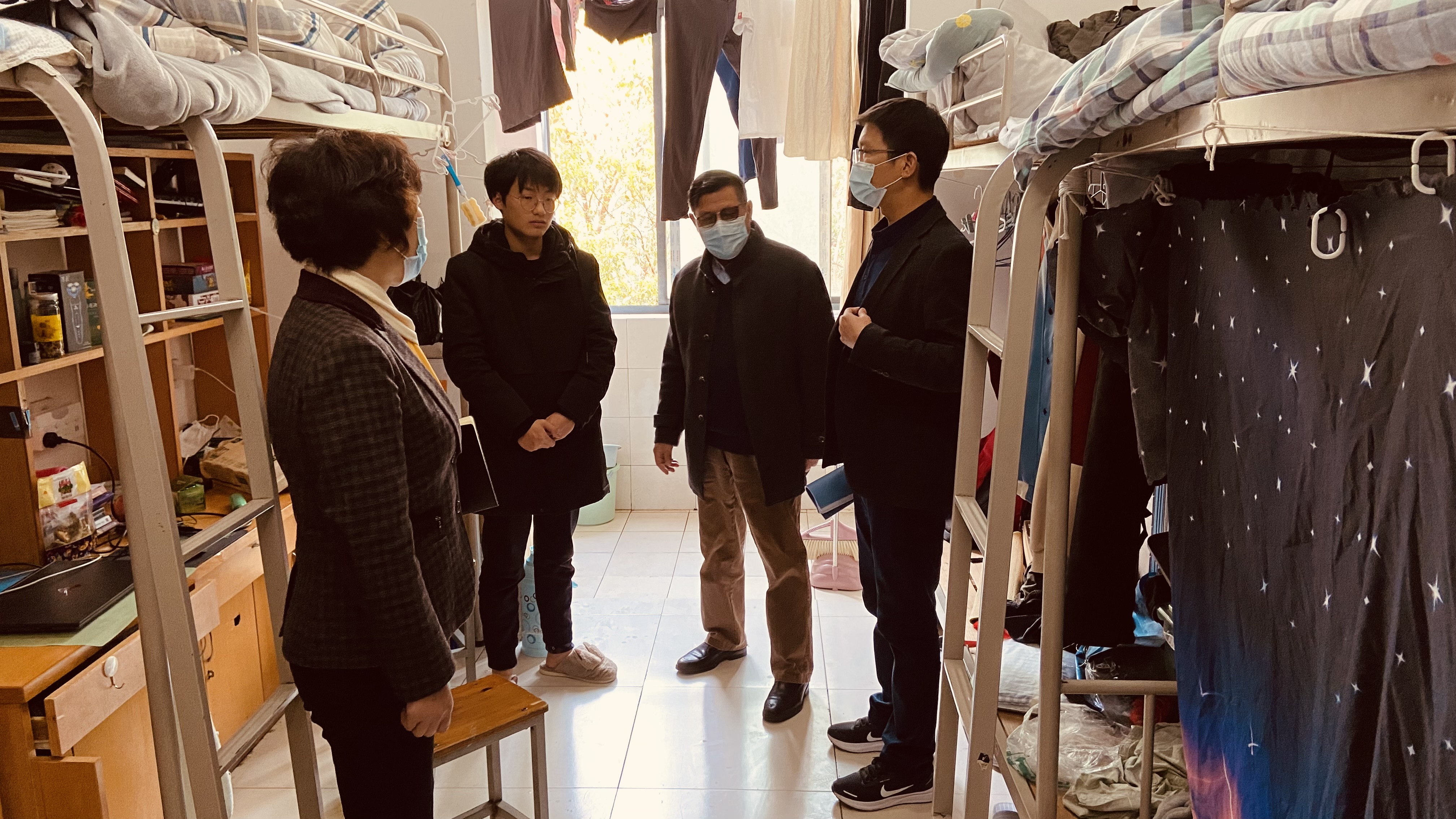 走访过程中,吴继敏校长一行先后来到9栋和10栋学生宿舍,与同学们亲切交流,详细询问了网课学习和生活情况,了解同学们所遇到的困难和需求。吴校长叮嘱同学们要切实加强个人防护,保持宿舍卫生,多通风,营造一个安全、健康、舒适的学习和生活环境,他鼓励同学们加强体育锻炼,注意劳逸结合,适时调整心态,遇到困难要跟辅导员和班主任沟通交流。