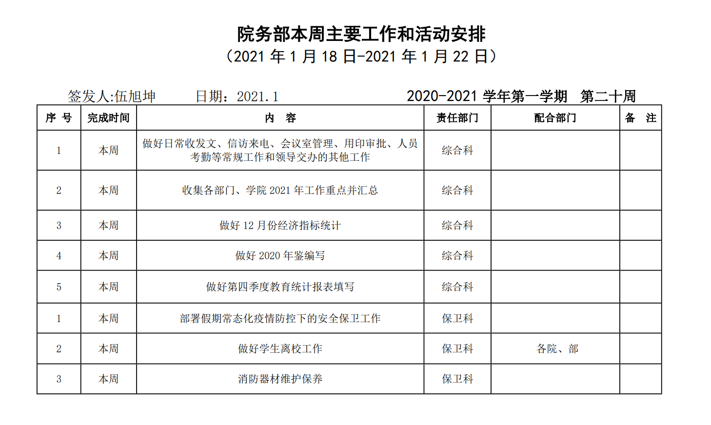 院务部第二十周工作安排.docx