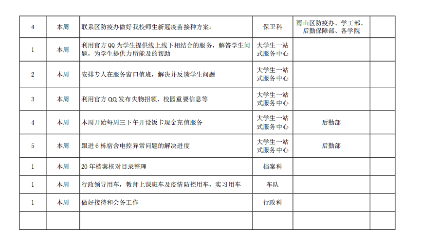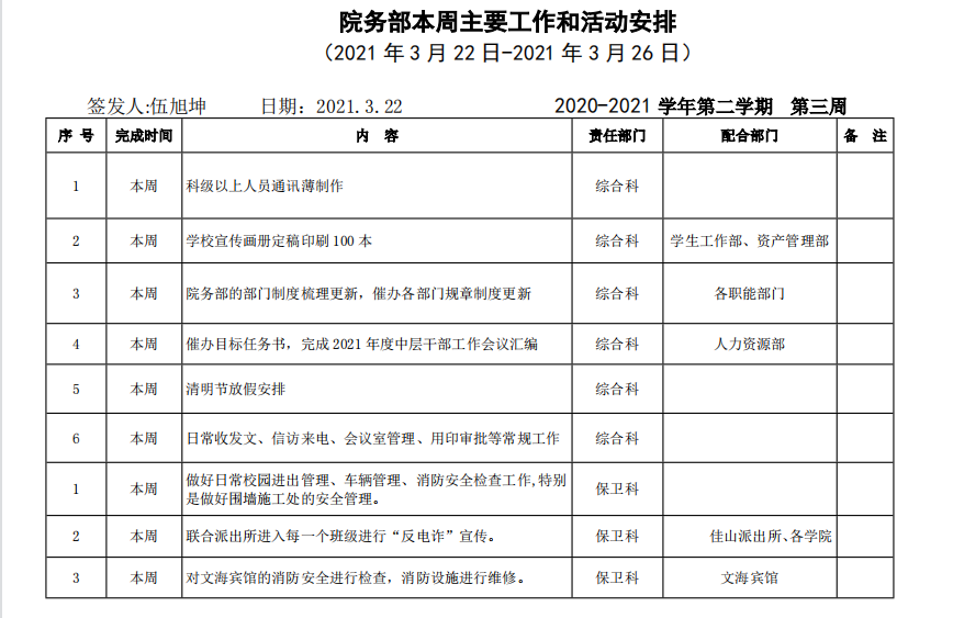皖江工学院院务部第三周工作安排