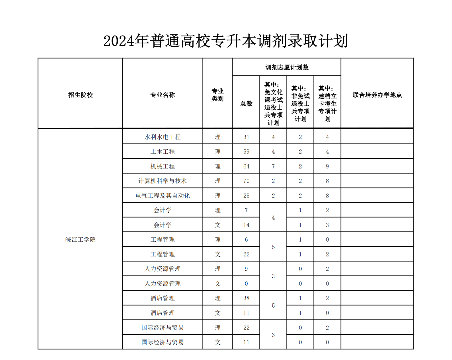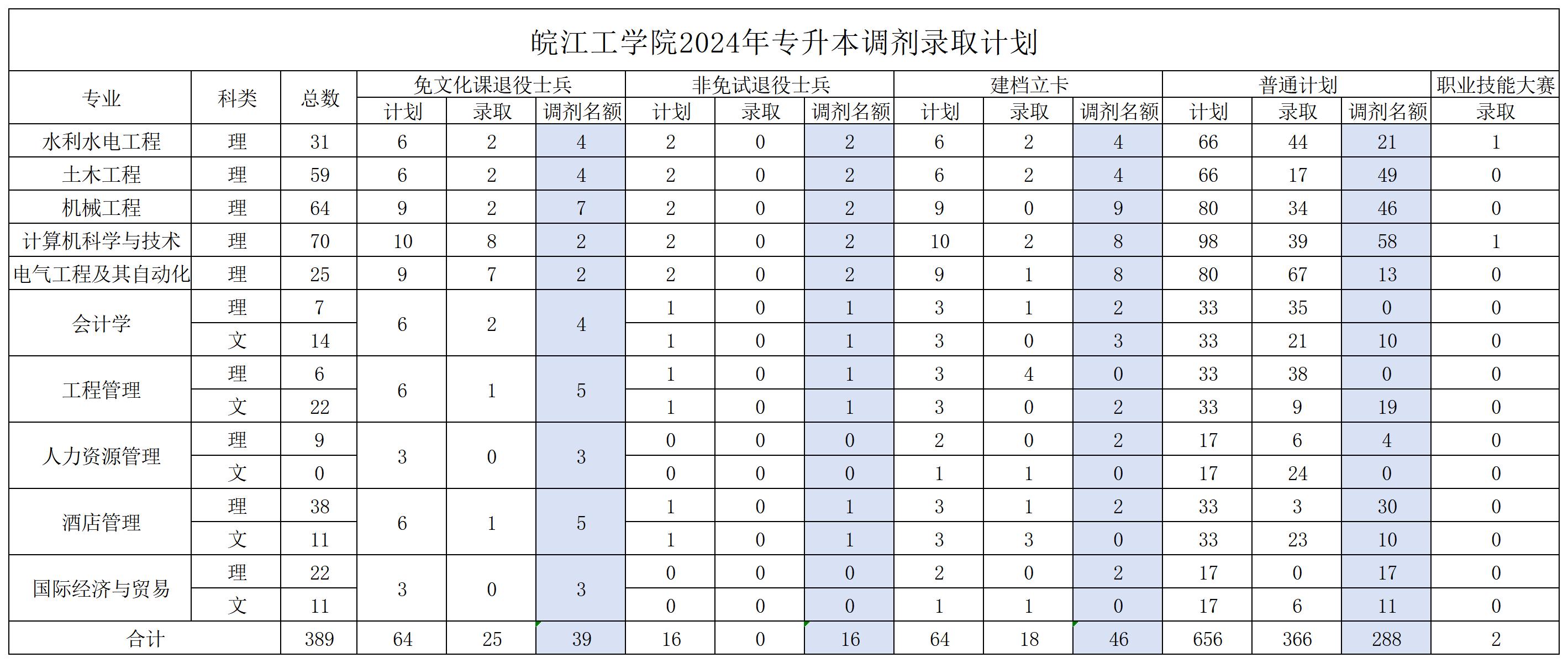 皖江工学院2024年专升本调剂录取计划