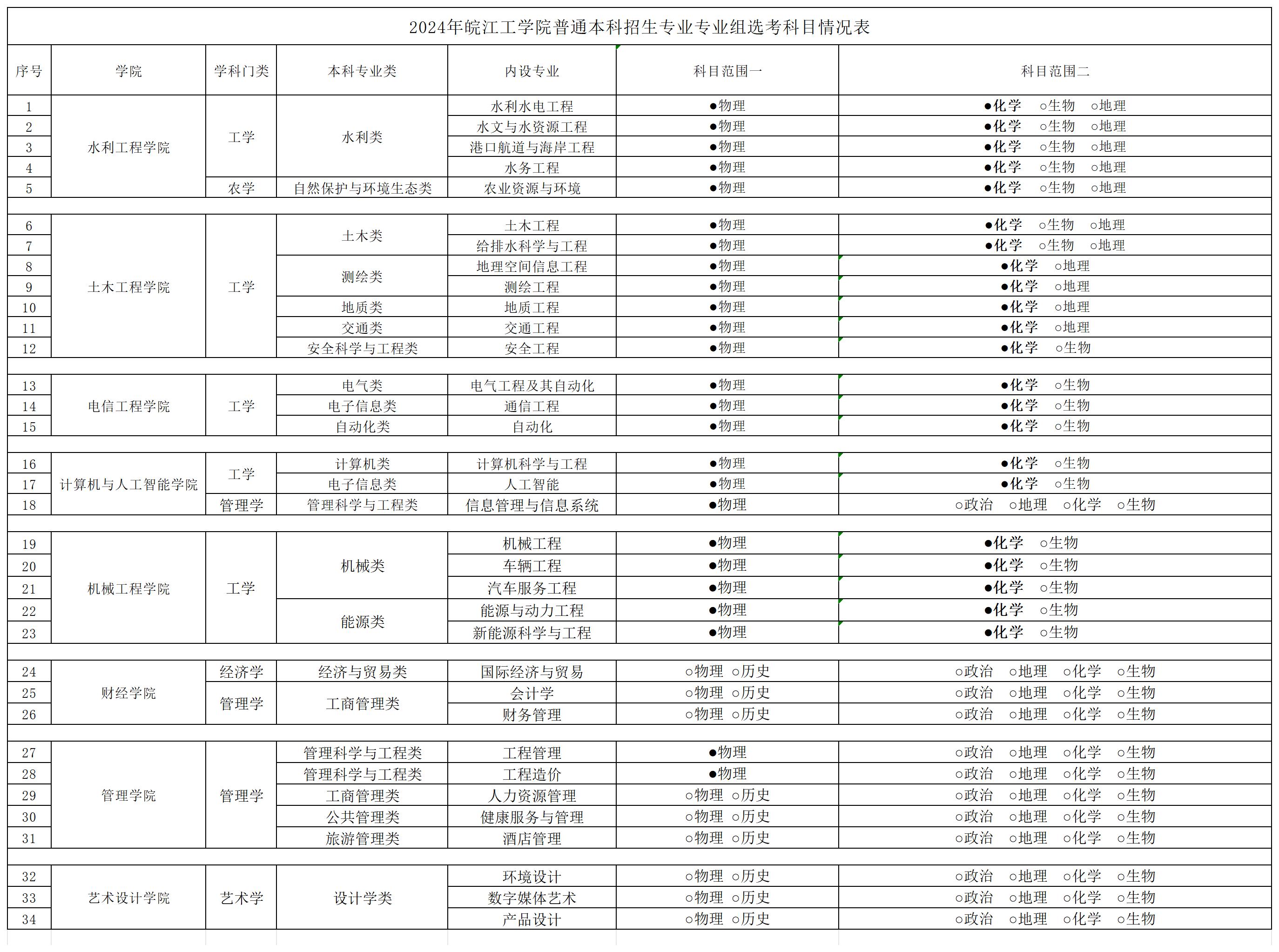 2024年皖江工学院普通本科招生专业专业组选考科目情况表