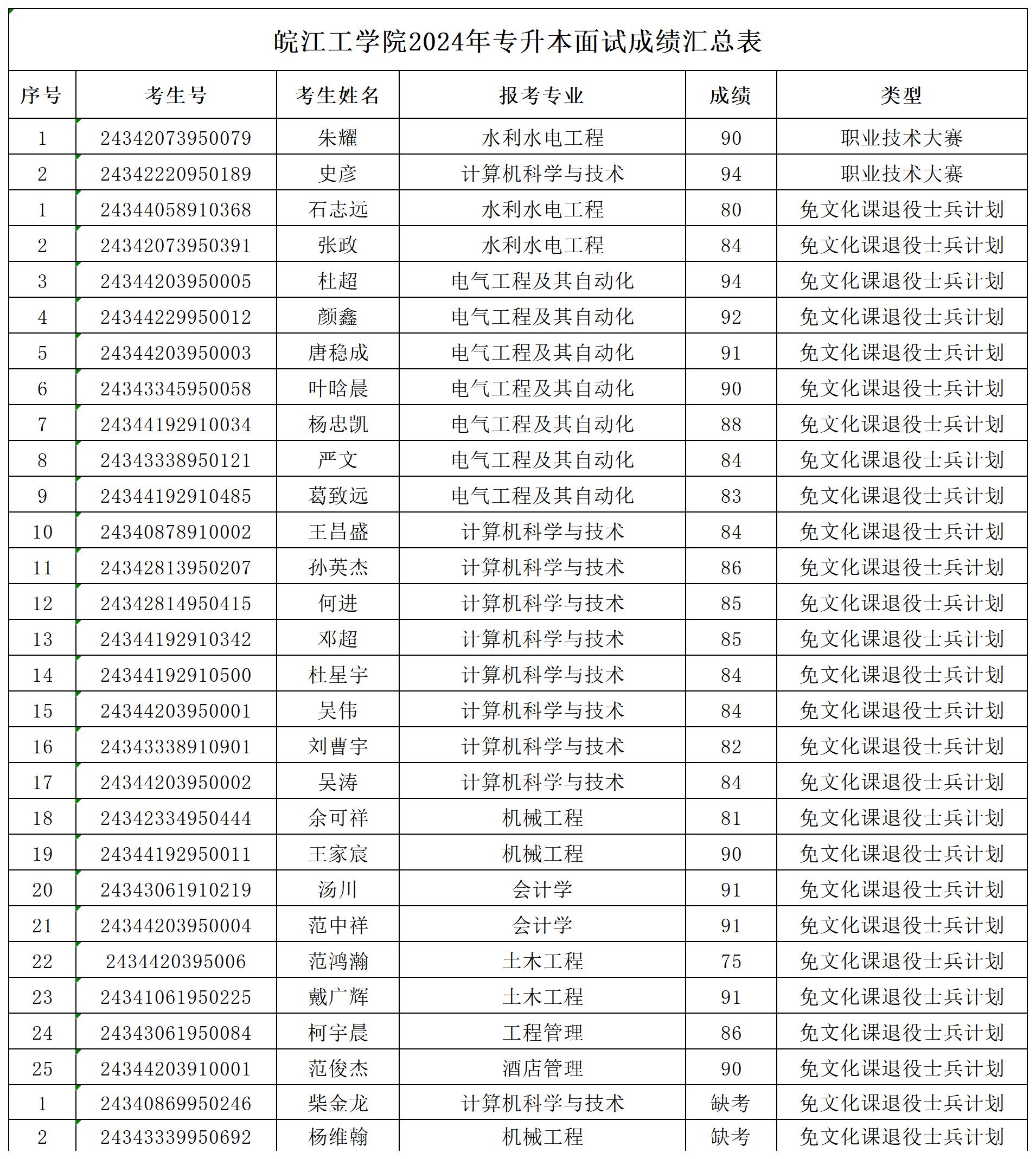 皖江工学院2024年免文化课退役士兵及职业技能大赛面试成绩公示