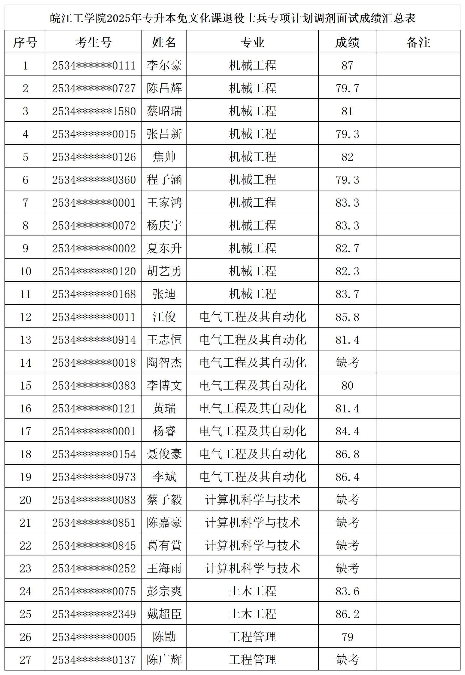 皖江工学院2025年普通高校专升本免文化课退役士兵专项计划调剂面试成绩公示