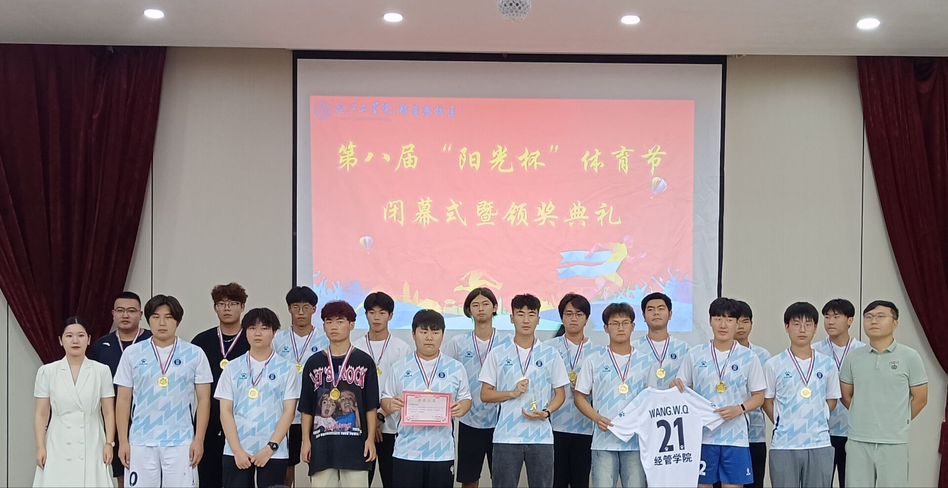 2024年6月19日下午,皖江工学院郑蒲港校区第八届“阳光杯”体育节颁奖典礼在图书馆报告厅盛大举行。此次体育节涵盖了足球、篮球、马拉松、拔河、羽毛球、乒乓球和排球等多个项目。各项比赛精彩纷呈,充分展现了大学生们的青春活力和拼搏精神。