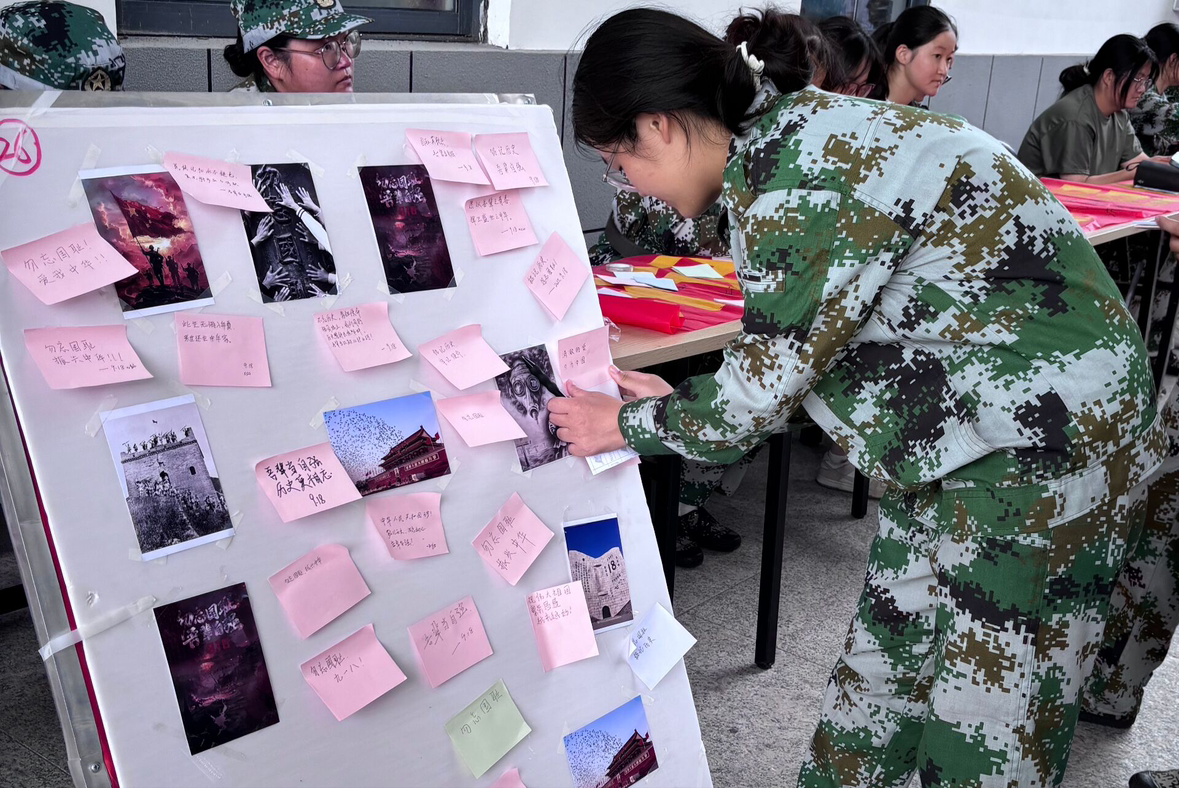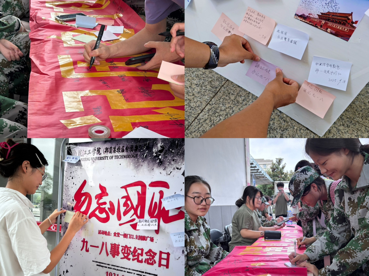 上午9时15分,校园广场上,师生方队和军训教官迅速集合完毕,整齐划一,目光坚定。9时18分,警报声准时响起,划破校园上空。全体人员静默肃立,垂首默哀,用这一分钟,悼念在抗日战争中牺牲的英烈和同胞。现场气氛凝重,无人言语,唯有微风轻拂,无人机在空中盘旋,抓拍这一庄严时刻,将这份敬意永久定格。默哀结束以后,校区分团委科技部干事们耐心为同学们讲述“九一八”事变的经过。从日本关东军的蓄意挑衅,到山河破碎、百姓蒙难,同学们听得全神贯注,悲愤与动容交织在脸上,仿佛回到那段烽火岁月,深刻体会到民族危亡之际的艰难与抗争。随后,老师和同学们在印有“铭记历史守初心•强国复兴担使命”字样的横幅上郑重地签下自己的名字,一笔一划,是承诺,是担当。留言板处,“勿忘国耻,振兴中华”、“以史为鉴,吾辈自强”等一句句铿锵的爱国标语,既是对先辈的致敬,更彰显着新时代青年的责任与担当。